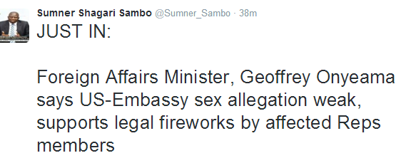 Minister of Foreign Affairs, Geoffrey Onyeama, says the allegation of sexual misconduct against the three lawmakers, Samuel Ikon, Mohammed Gololo and Gbillah Mark is weak and supports legal action by the accused lawmakers. This is according to TVC's senior correspondent, Sumner Shagari Sambo. The US outgoing ambassador, James Entwistle, has failed to appear before the panel on two occasions to provide video evidence indicting the accused lawmakers. .